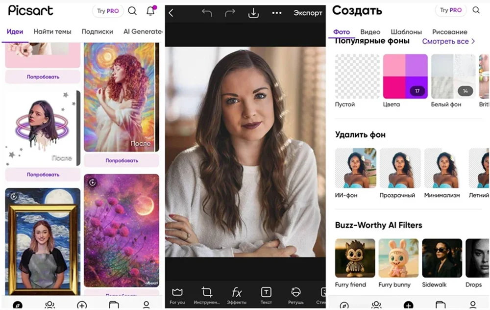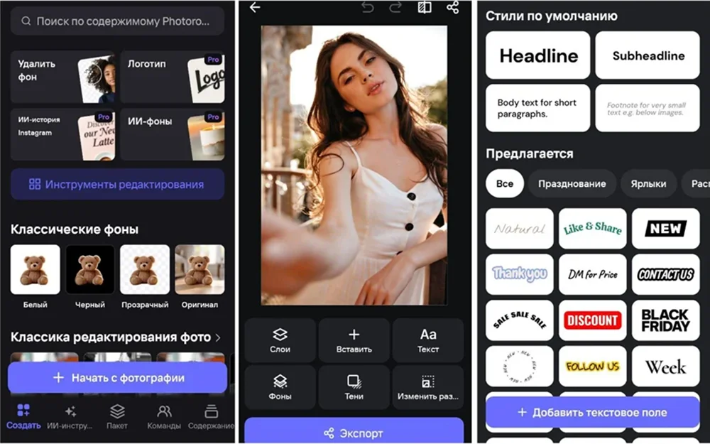 ПАО, которое можно использовать в браузере или скачать на телефон. Предоставляет обширный инструментарий для редактуры фотокарточек, а также шаблоны для коллажей и макеты для дизайна. Содержит множество AI-функций.