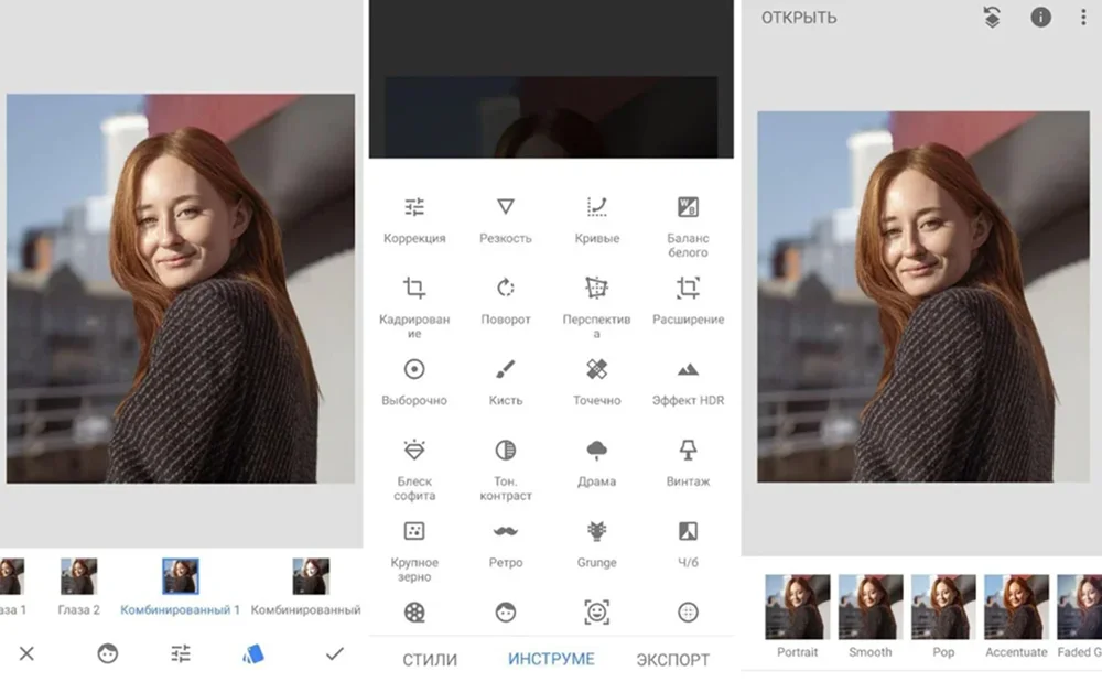 Позиционируется как полноценный фоторедактор от Гугл. В библиотеке приложения — более 25 средств обработки снимков. Это точечные и глобальные правки, касающиеся цветовых параметров, ретуши и размытия. Имеет много спецэффектов вроде блеска софита, стилизации под цветное кино 50–70 годов, придании кадру драматичного оттенка.