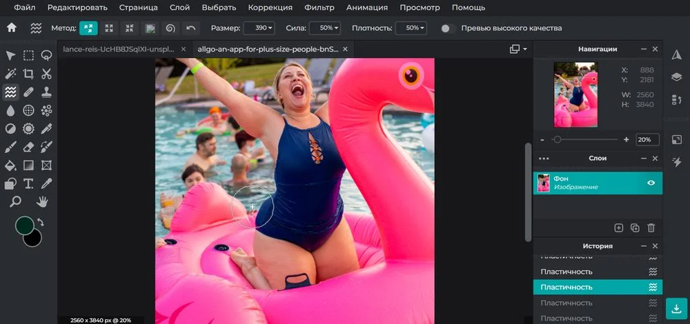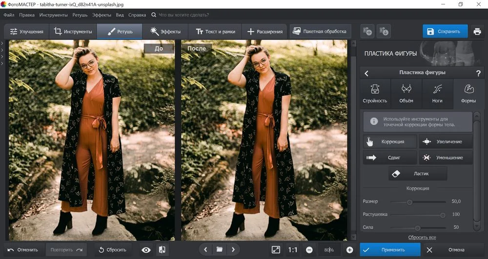 Лучший фоторедактор тела на ПК среди простых вариантов. Его легко освоят новички, а результат будет не отличить от обработки в профессиональных редакторах. Для нашей задачи в редакторе есть специальная функция — «Пластика фигуры». Достаточно настроить область и силу эффекта.