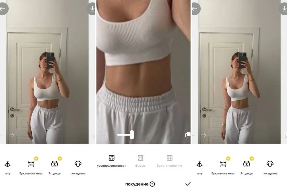 Простое приложение для коррекции фигуры на фото. Все инструменты регулируются с помощью слайдеров, так что обрабатывать снимки в нем быстро и легко. Есть дополнительные возможности для украшения снимков — тату и фильтры.