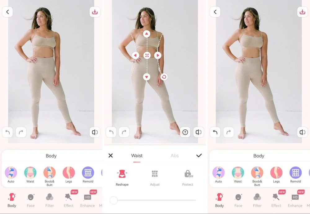 Мобильный редактор тела на фото, который предлагает полуавтоматическую и ручную корректировку. Все функции интуитивно понятные, так что приложение подойдет для простого улучшения снимков.