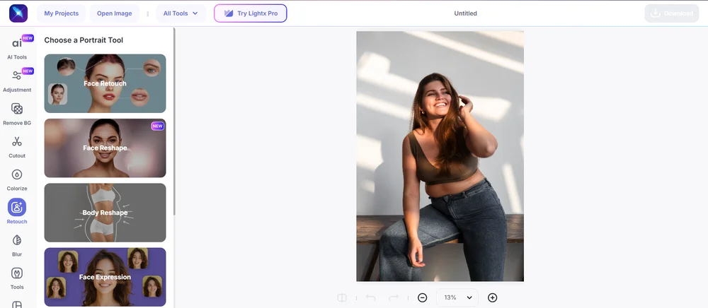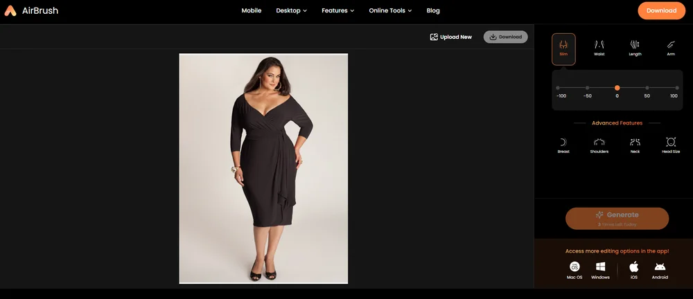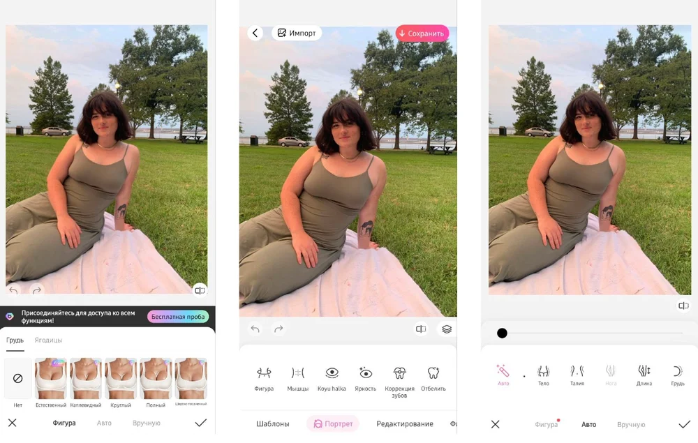 Редактор фигуры на фото с искусственным интеллектом. Подходит для полноценной обработки фотографий, в том числе изменения силуэта и лица. Большинство функций сервиса платные, но для базовой корректировки вполне будет достаточно бесплатных.