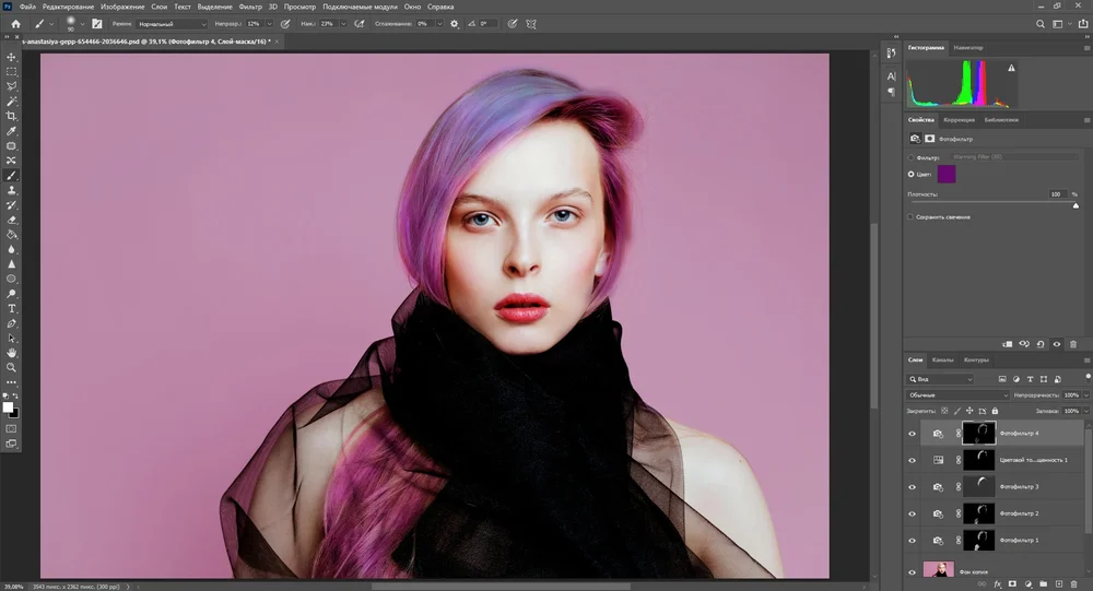 - можно комбинировать на одном фото разные варианты обработки — чтобы попробовать другое окрашивание, достаточно переключить видимость слоя.