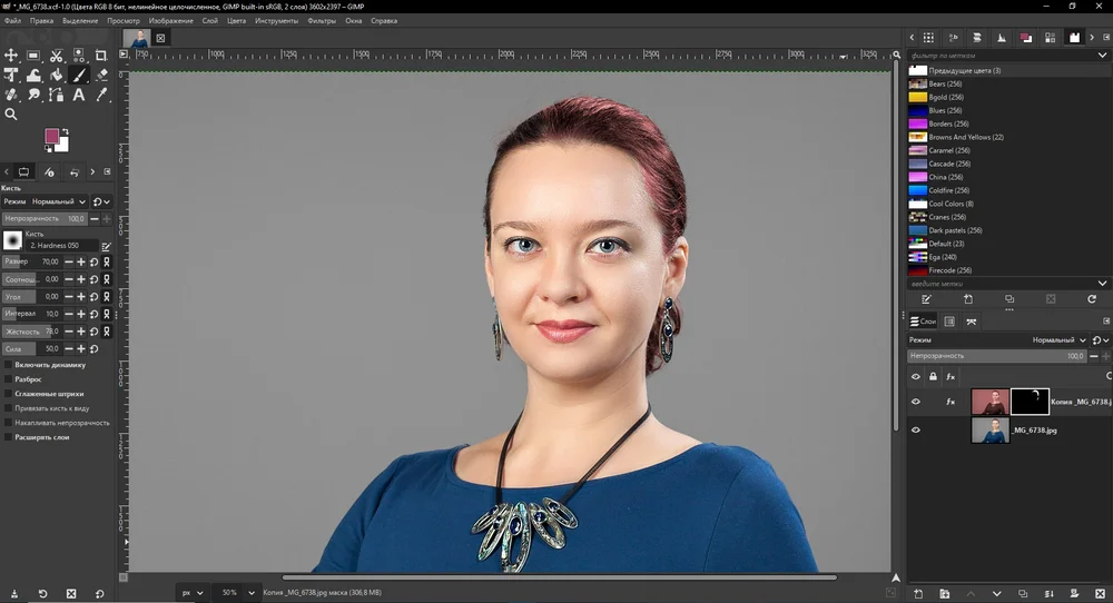 Редактор с открытым исходным кодом позиционируется как бесплатный аналог Фотошопа. Но по сравнению с другими программами для подбора цвета волос, имеет меньшие возможности для выделения областей и настроек. Чтобы прическа выглядела максимально естественной, потребуются значительные усилия.