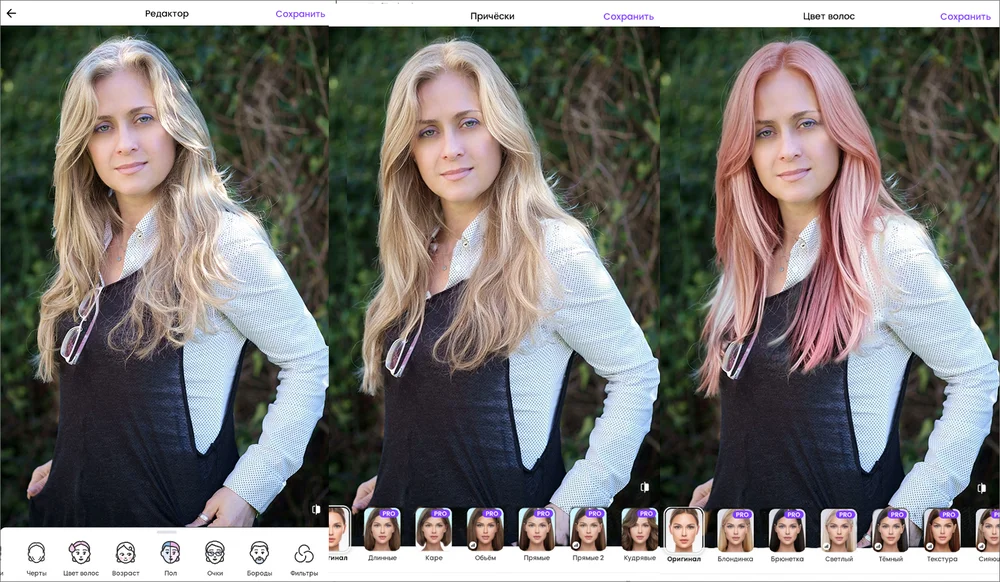 - функции «Тонирование», «Цветовая насыщенность» и «Замена цвета» для имитации окрашивания;