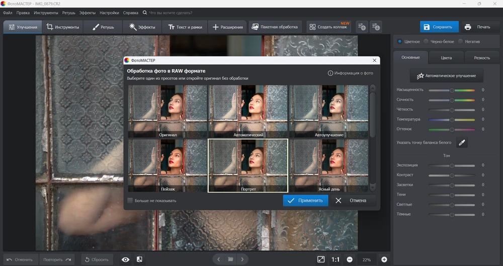 Поскольку «сырой» формат требует дальнейшей обработки и конвертации в более удобное расширение, вы можете скачать на компьютер фоторедактор. Например, ФотоМАСТЕР. Это удобное ПО, в котором можно просматривать, преобразовывать и редактировать равы. Есть даже пакетный режим.