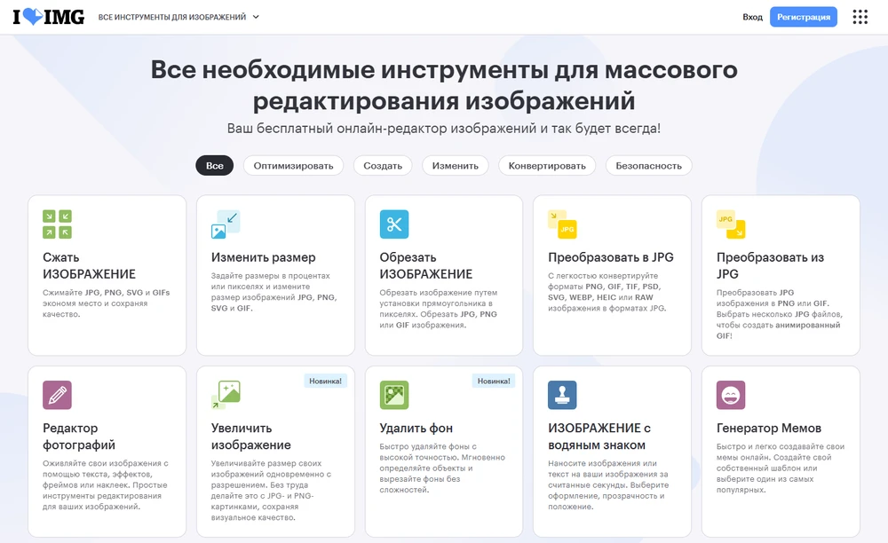 Сервер, который кроме конвертации предлагает и другие функции по работе с изображениями на автоматической основе. Это сжатие, обрезка, пакетная обработка, удаление фона, генерация мемов.