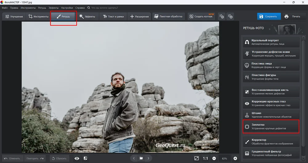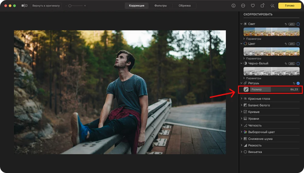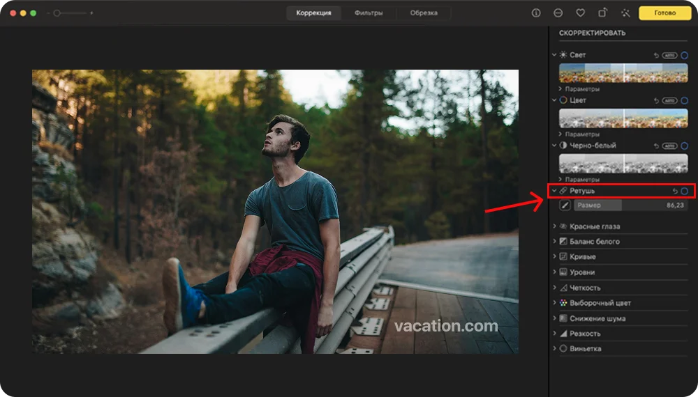 - Сверху откройте раздел «Ретушь» и на панели справа найдите нужный инструмент.