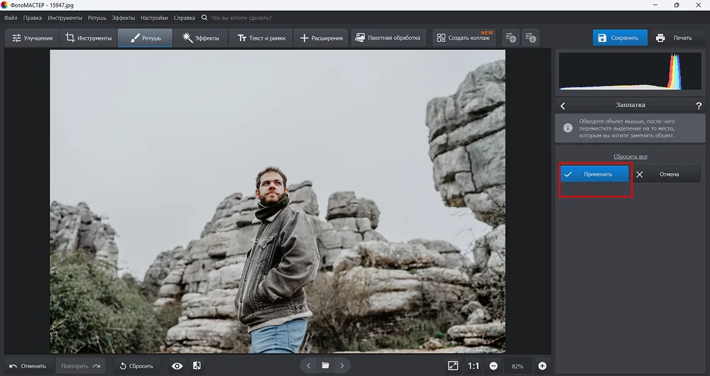 Предлагаем рассмотреть, как убрать надпись с фото при помощи программы ФотоМАСТЕР. Этот софт прост в использовании и предлагает продвинутые инструменты. Для удаления дефектов (в том числе надписей) в программе имеются инструменты ретуши: «Восстанавливающая кисть», «Заплатка» и «Штамп».
