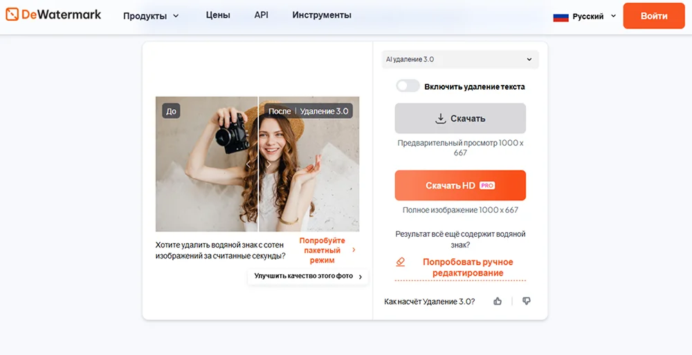 Один из лучших сервисов, специализирующихся на ликвидации лишних надписей. Хорошо справляется даже со сложными вотермарками, перекрывающими важные части или занимающими всю площадь кадра. Вы можете обрабатывать одиночные фото или использовать пакетный режим, а также менять модели ИИ.