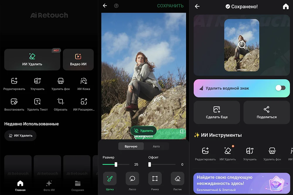 Простое в использовании ПО для удаления различных нежелательных элементов: водяных знаков, текста, подписей, логотипов, наклеек, предметов. Также тут есть дополнительные функции: ИИ-образ на аватар, клонирование людей, кадрирование при помощи пресетов с готовыми пропорциями. При бесплатном использовании оставляет свой собственный водяной знак. Есть версии под айфон и Андроид.