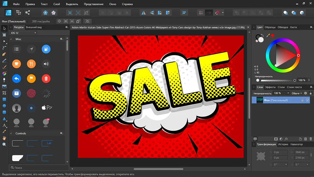 Подходит для разработки объявлений, логотипов, иллюстраций. Есть средства для работы с векторной и растровой графикой. Реализованы широкие возможности по работе с текстом: можно сделать обтекание по контуру, деформировать надпись, наложить эффекты теней и свечения.