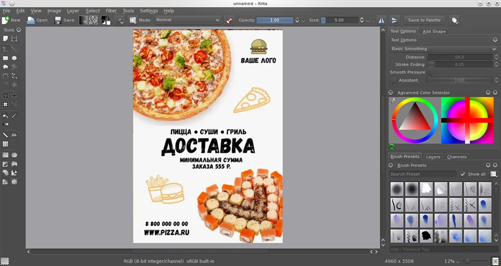 Растровый редактор с возможностью вывода файла на печать. Имеет продвинутые средства коррекции: «Кривые», «Уровни», «Цветовой баланс». Поддерживает работу со слоями в разных режимах наложения, что позволяет создавать сложные визуальные эффекты. Есть кисти для рисования с разными текстурами и динамикой. Функциональность можно расширить за счет плагинов.
