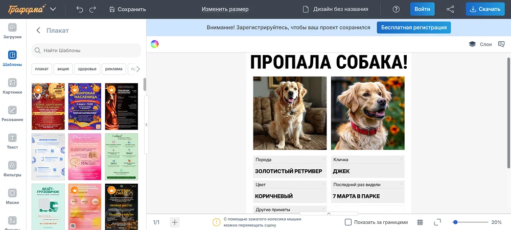 | Canva | веб, iOS, Android | нужна | большое количество | PDF, JPG, PNG, SVG |