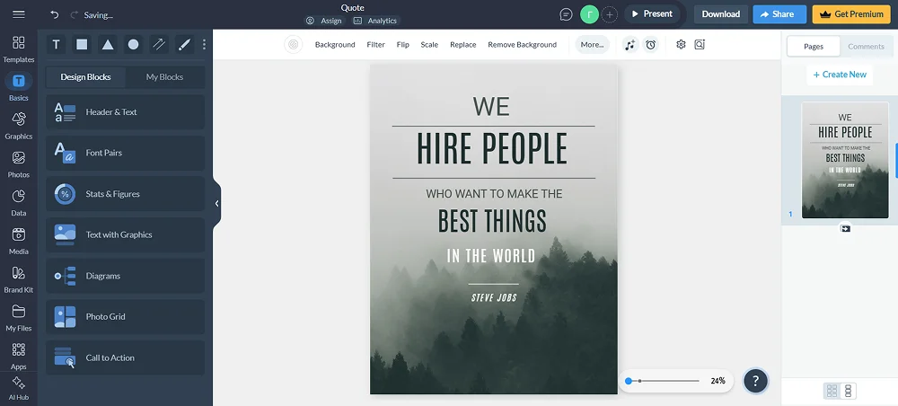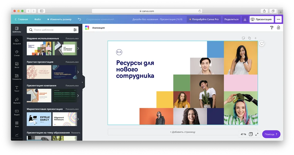 Облачный сервис, предназначенный для оформления визуального контента. В вашем распоряжении средства для разработки объявлений, видео, презентаций и других типов графических материалов. Сервис предлагает широкий выбор готовых дизайнерских пресетов, которые можно использовать как основу или модифицировать под конкретные задачи. Также есть возможность создавать проекты с нуля.