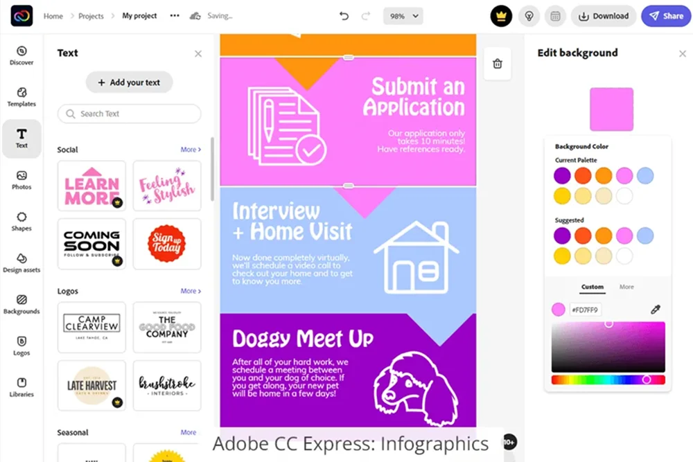 Приложение для создания афиш с большим выбором инструментов. Здесь можно добавлять фигуры, картинки и текстовые элементы, а также обрабатывать снимки и рисовать. Есть умные алгоритмы, которые анализируют фото и самостоятельно решают, что в нем исправить.