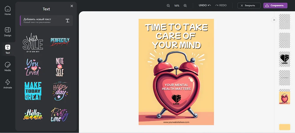 Это платформа, включающая в себя несколько приложений. Если вам нужны профессиональные шаблоны, то нужно использовать Pixlr Designer и выбрать нужный образец. Вас перебросит в редактор, где можно модифицировать пресет под текущую задачу. Pixlr поддерживает работу с высоким разрешением, что критически важно для материалов, предназначенных для распечатки больших форматов.