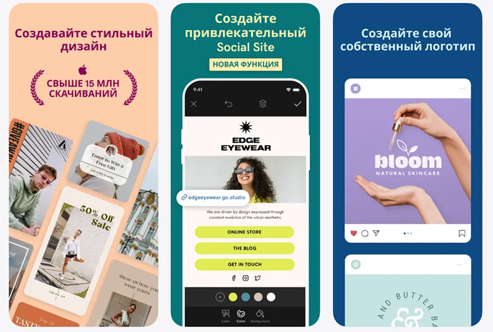 - GoDaddy Studio — мобильный конструктор, который позволит разработать дизайн постов для соцсетей, баннеры и рекламные материалы.