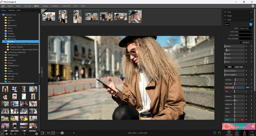 - 🏆 ФотоМАСТЕР — простое решение для пользователей без опыта работы с аналогичными программами. В режим массового преобразования можно корректировать множество параметров (свет, цвет, контраст, температуру), а также накладывать стильные фильтры.