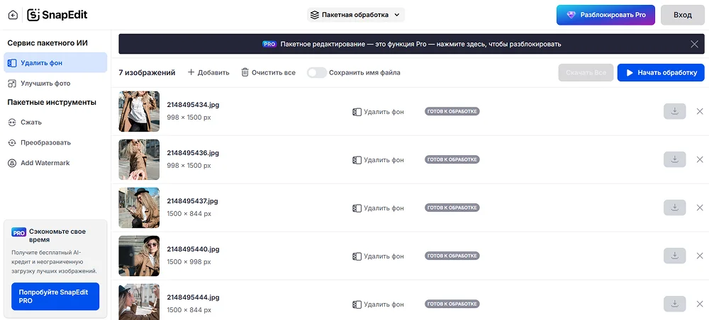 | SnapEdit (Снэп Эдит) | веб | не нужна | удаление фона, сжатие картинок, конвертация, добавления водяного знака, общее улучшение |
