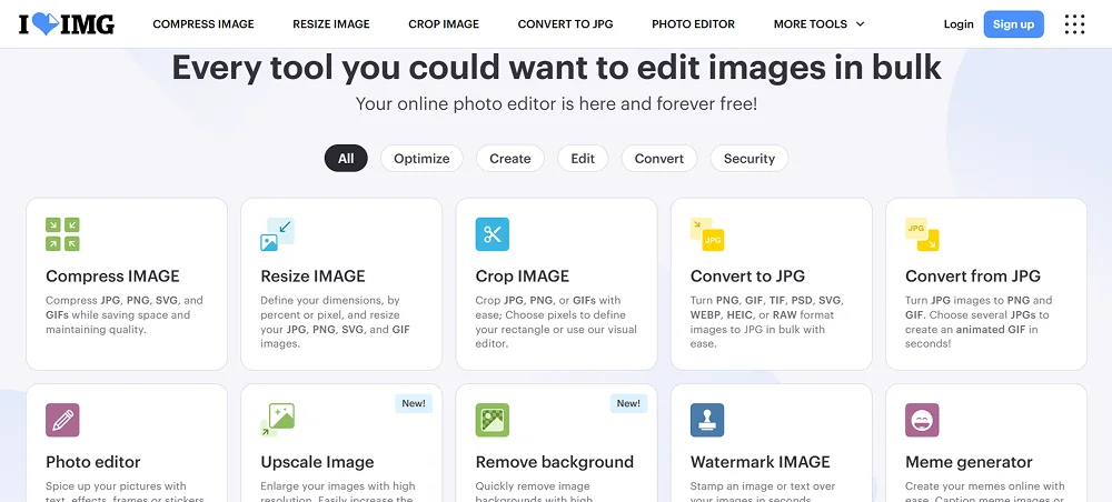 Это целый спектр онлайн-инструментов, каждый из которых отвечает за конкретную задачу. Здесь можно изменить размер, сжать фото, преобразовать в другое расширение, добавить метки и т.д. Обрабатывать можно как один снимок, так и сто. Каждый инструмент обычно предлагает минимальное количество настроек, что делает сайт очень простым в использовании.