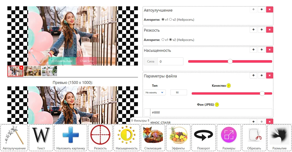 | AnyTools.pro (ЭниТулс.про) | веб | не нужна | общее улучшение, резкость, насыщенность, смена формата, наложение фильтра |