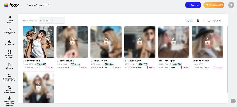 Одновременно улучшение графических файлов здесь реализовано через отдельный инструмент. Групповые операции проводятся через ИИ-фильтры. Так можно удалять фон, реставрировать, обрезать ненужные части, манипулировать размером и форматом, делать ретушь. Однако без приобретенной подписки к обработке допускается лишь одно фото.