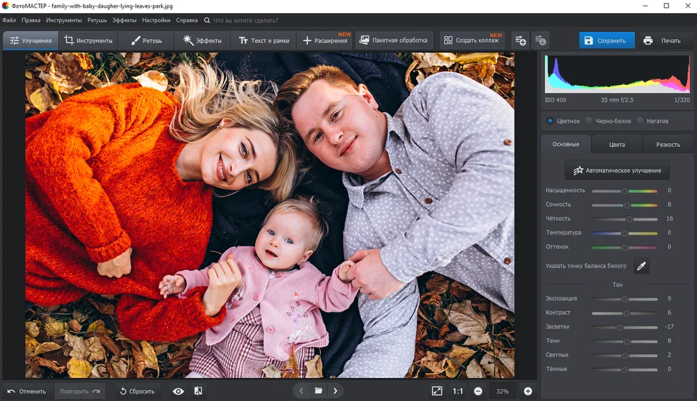 Создание фотоальбома — это прекрасный способ сохранить воспоминания и поделиться ими с близкими. Но чтобы ваш альбом действительно радовал глаз, важно тщательно подготовить фотографии. Вы можете сделать это в программе ФотоМАСТЕР. Это простое ПО с большим количеством ручных и автоматических функций и готовых фильтрами.