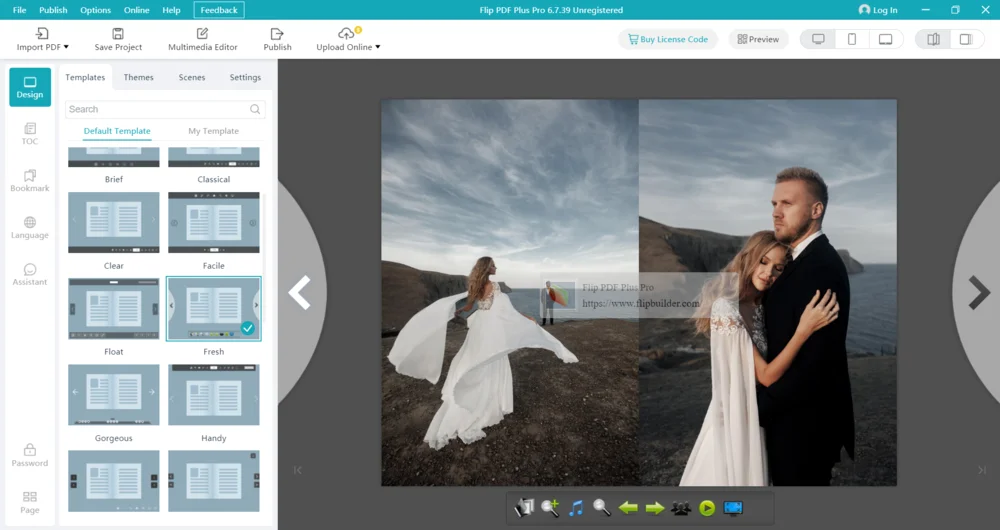 Нужно загрузить файлы в программу и выбрать дизайн, все снимки по макету будут распределены автоматически. Объем — до 1000 страниц. Есть функция встраивания аудио, видео и ссылок. Готовую электронную книгу можно «подогнать» под размер экрана телефона, ПК и планшета при помощи пресетов.
