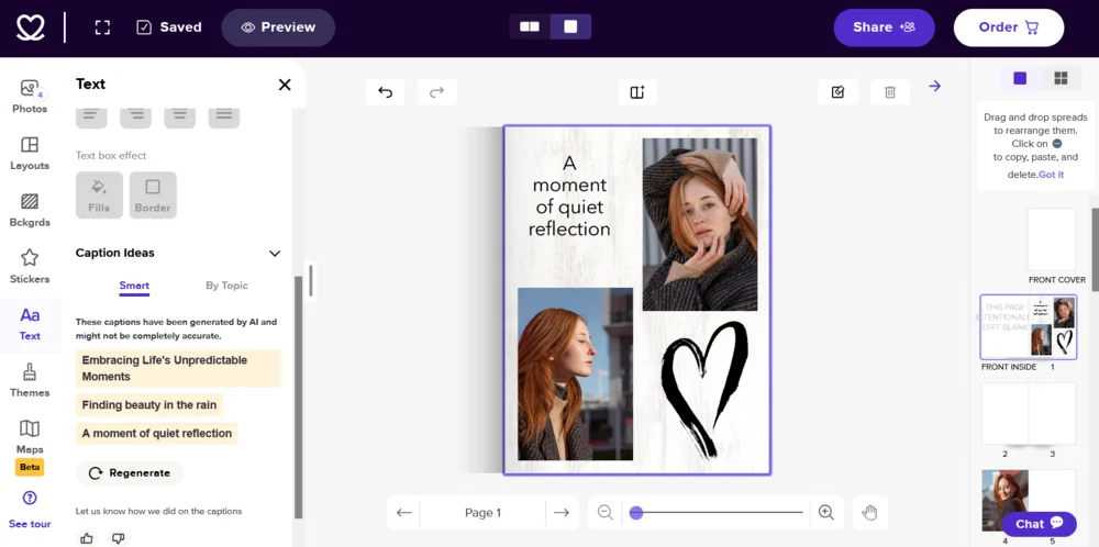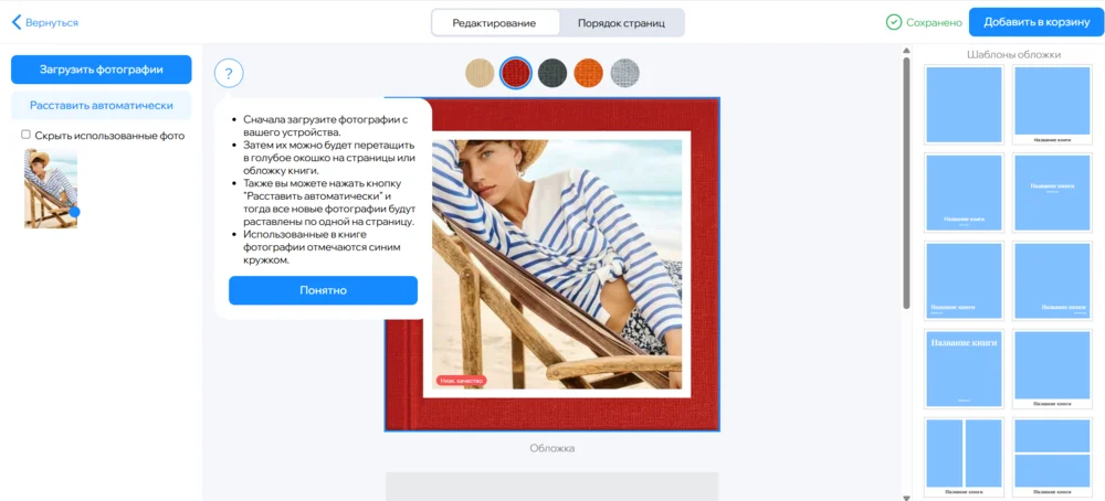Для каждого шаблона есть варианты переплета. Вы можете откадрировать снимки или изменить их порядок, выбирать схемы расположения на страницах (по одной, по две и т. д.), вставлять текстовые блоки.