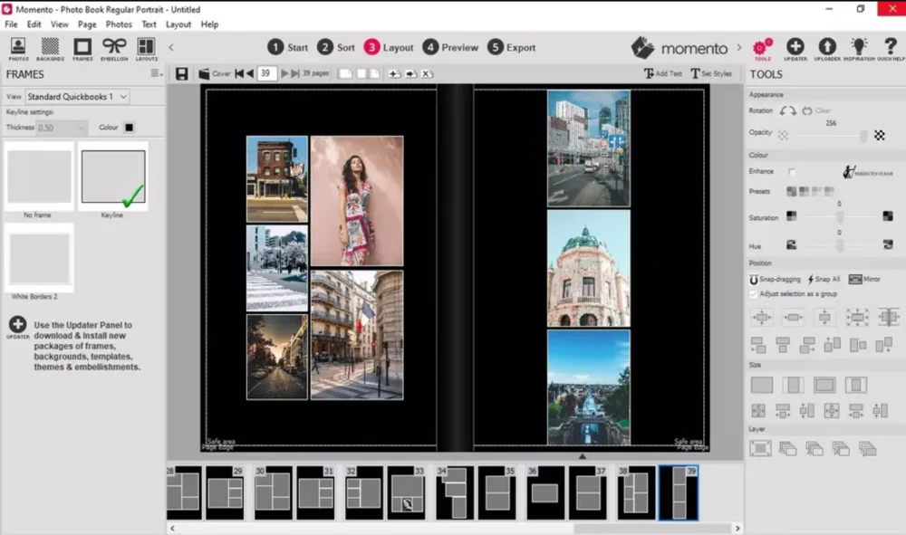 Софт предоставляет широкий выбор шаблонов для верстки фотоальбомов в домашних условиях. Также есть возможность вставлять персонализированные видео для интерактива. При распечатке альбома видеофайл интегрируется в виде QR-кода, который легко отсканировать с помощью смартфона. К изображениям можно добавлять GPS-данные, также есть возможность украшать страницы стикерами и клипартом из коллекции.