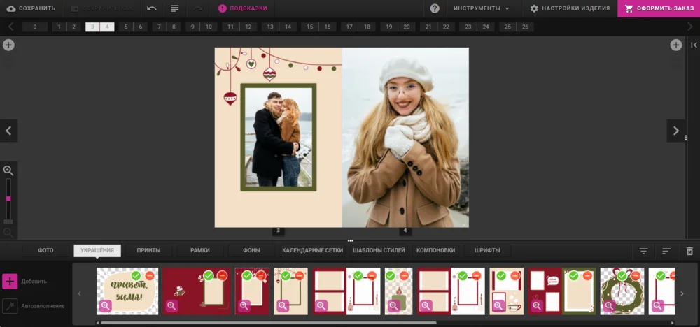- множество готовых шаблонов и тематических дизайнов (путешествия, свадьба, дети и т. д.);