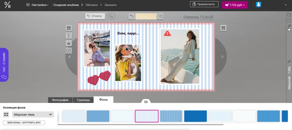 Алгоритм сборки идентичен другим упомянутым в статье сервисам: сначала выбираете внешний вид книги, затем видоизменяете шаблон в соответствии со своими пожеланиями и возможностями сайта. Минимальное количество страниц — 20. Разместить на них можно от 1 до 500 фотографий.
