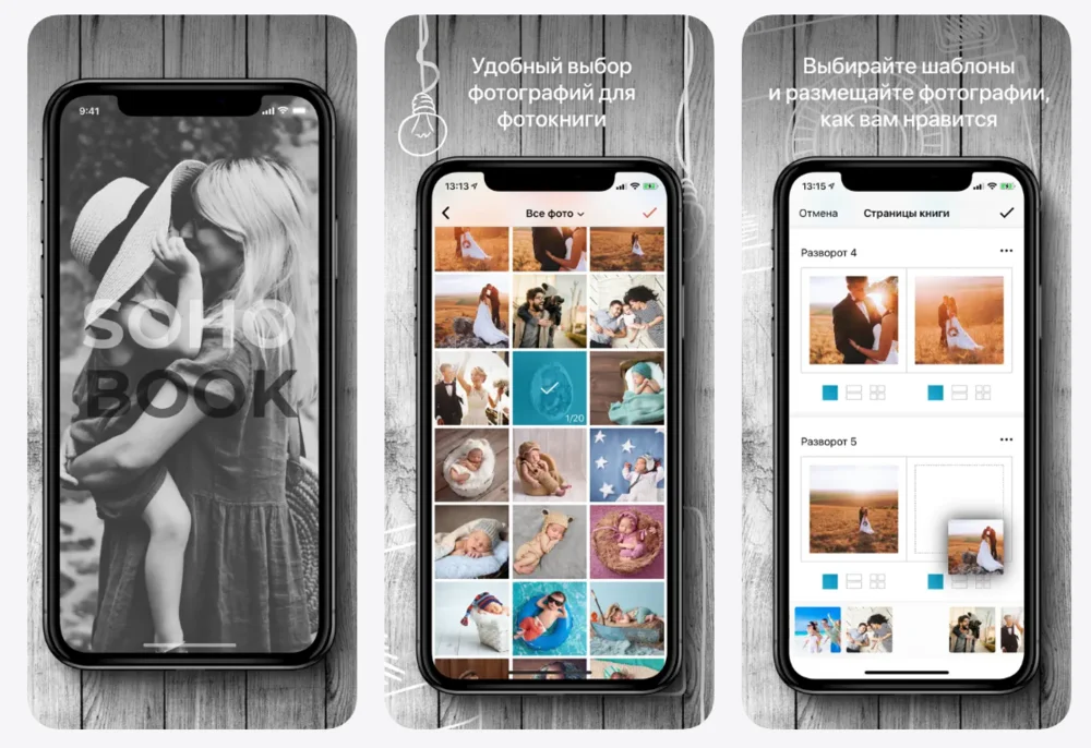 | Sohobook | iOS, веб | нужна для сохранения альбома | 25 вариантов цвета обложки и более 70 принтов, множество изменяемых шаблонов, высокое качество печати и правильная цветопередача. |