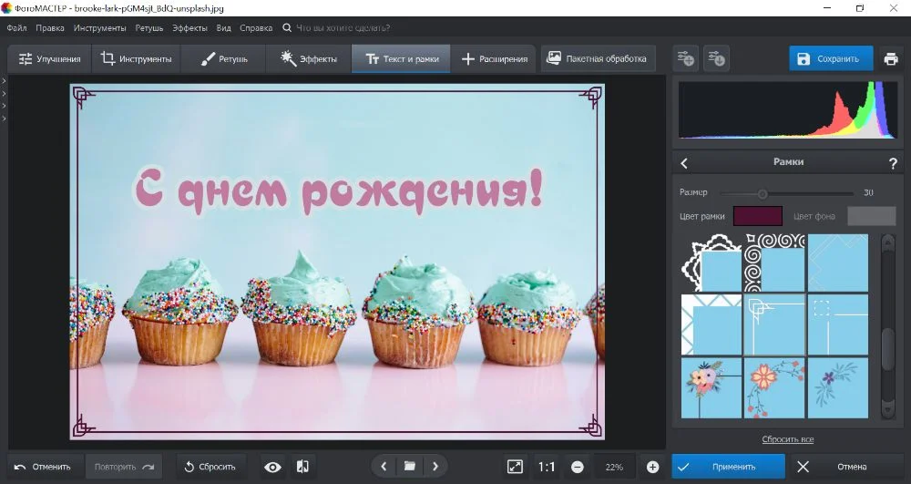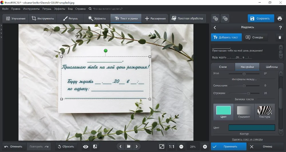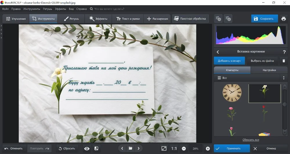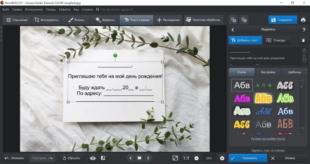 ФотоМАСТЕР — идеальное решение, если вы хотите создать открытку или приглашение полностью самостоятельно. В качестве основы используйте любое изображение из интернета или же свое. Вы сможете расположить поверх кадра надписи и различные украшения. При этом в фоторедакторе доступны готовые стили текста и каталог клипарта, которые значительно упростят процесс оформления. Также вы можете заменить фон, наложить поверх любые картинки с ПК, добавить стильные рамки и многое другое.