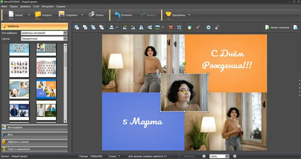 - встроенная библиотека содержит 300+ шаблонов коллажей: новогодние, поздравления с днем рождения, выпускным, 23 февраля и т. д.;