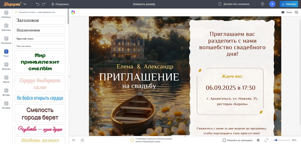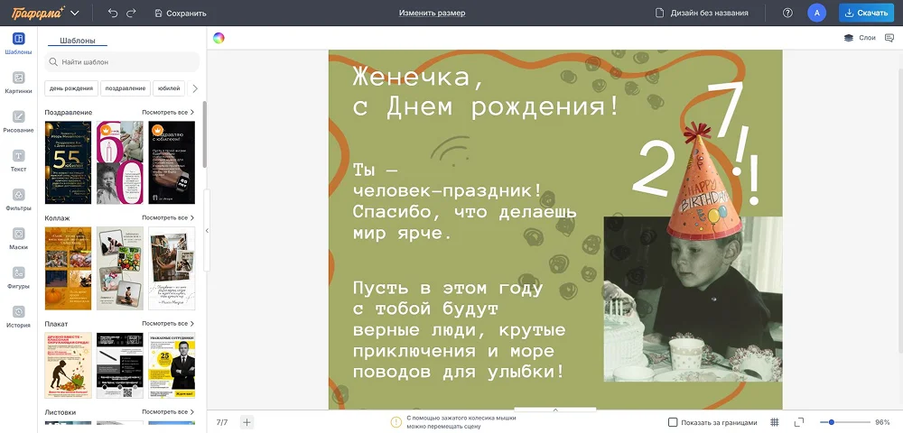 - Граформа – онлайн-редактор, позволяющий с легкостью создавать крутые фотооткрытки и любую другую визуальную графику. Работу можно начать без регистрации.