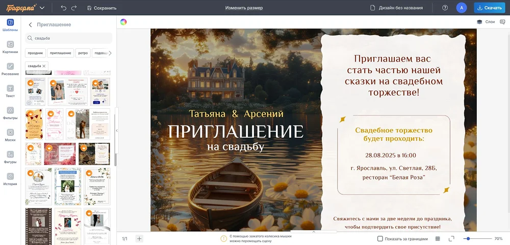 - Введите данные: имена жениха и невесты, дату свадьбы, адрес и т. д.