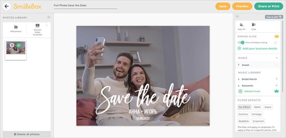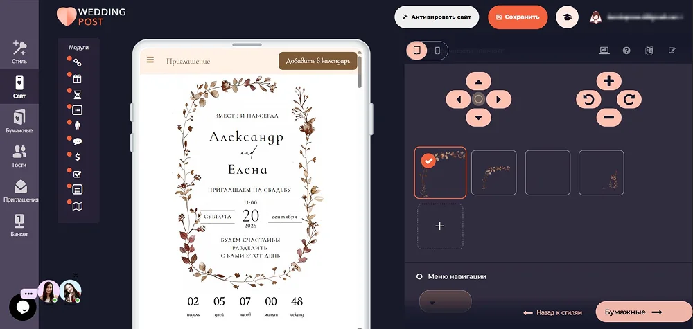 Графический редактор позволяет оформить свадебное бумажное приглашение и сайт со всей информацией о мероприятии. В Wedding Post можно получить доступ к более 40 заготовкам, указать имя невесты, жениха и дату события. После вы сможете поместить дополнительные надписи, подобрать другой фоновый рисунок и скорректировать положение и масштаб графики.