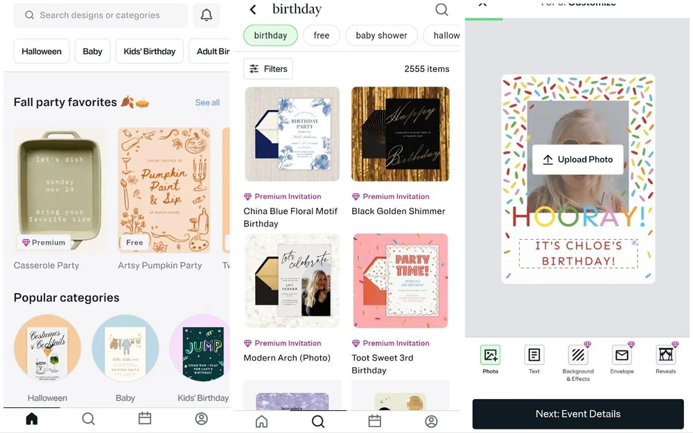- Evite – мобильное программное обеспечение для Андроида и айфона. Подходит для изготовления приглашений на основе готовых макетов.