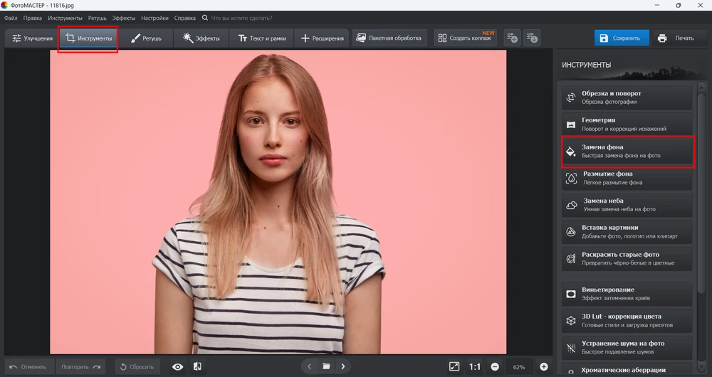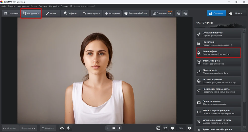 - Перейдите в «Инструменты» и выберите пункт «Замена фона».