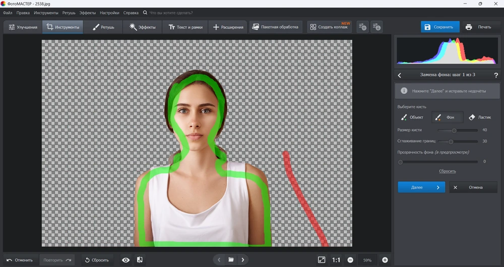 - Нажмите «Далее». Максимально снизьте прозрачность задника на соответствующей шкале, чтобы увидеть огрехи. Если кусочки фона остались на краях объекта, той же красной кистью аккуратно их удалите. При этом параметр растушевки поставьте хотя бы на 50% — так края будут выглядеть мягче.