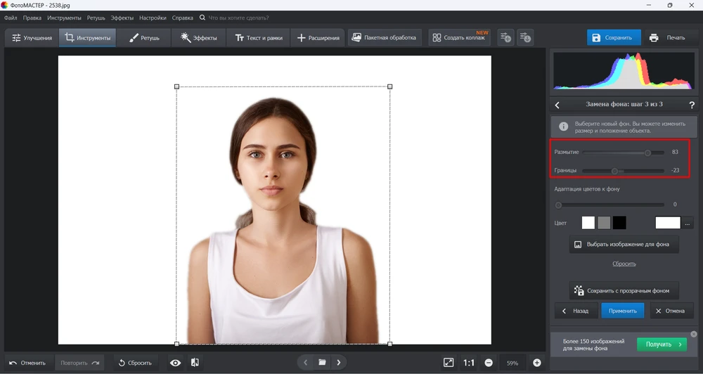 - На следующем этапе вы сможете сузить границу выделения. Так окантовка фона по границам объекта исчезнет окончательно. Также рекомендуем немного повысить значение «Размытия» для смягчения краев. Цвет заднего плана выберите белый и нажмите на кнопку «Применить».