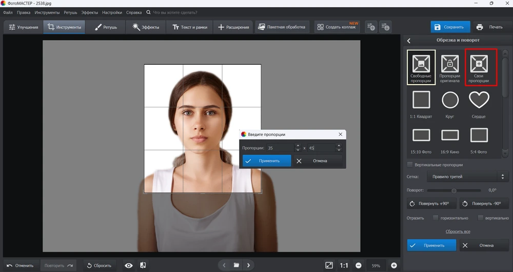 - Перейдите во вкладку «Обрезка и поворот». Среди пресетов найдите «Свои пропорции» и в окошко введите значения, соответствующие выбранному типу документа.