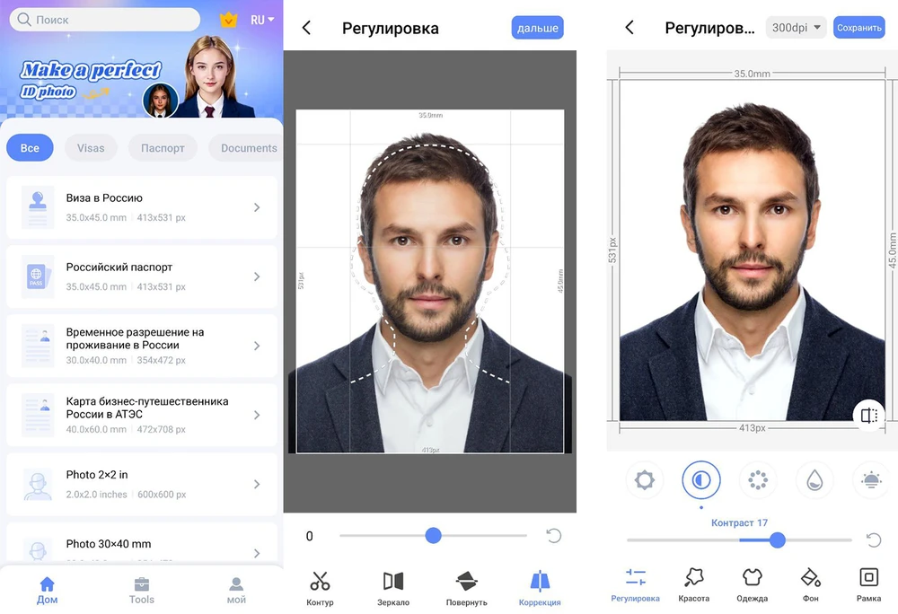 Кроссплатформенный фоторедактор на основе ИИ. Для граждан РФ предлагаются шаблоны внутреннего паспорта, загранпаспорта, водительского удостоверения и визы в США. Весь процесс автоматический.